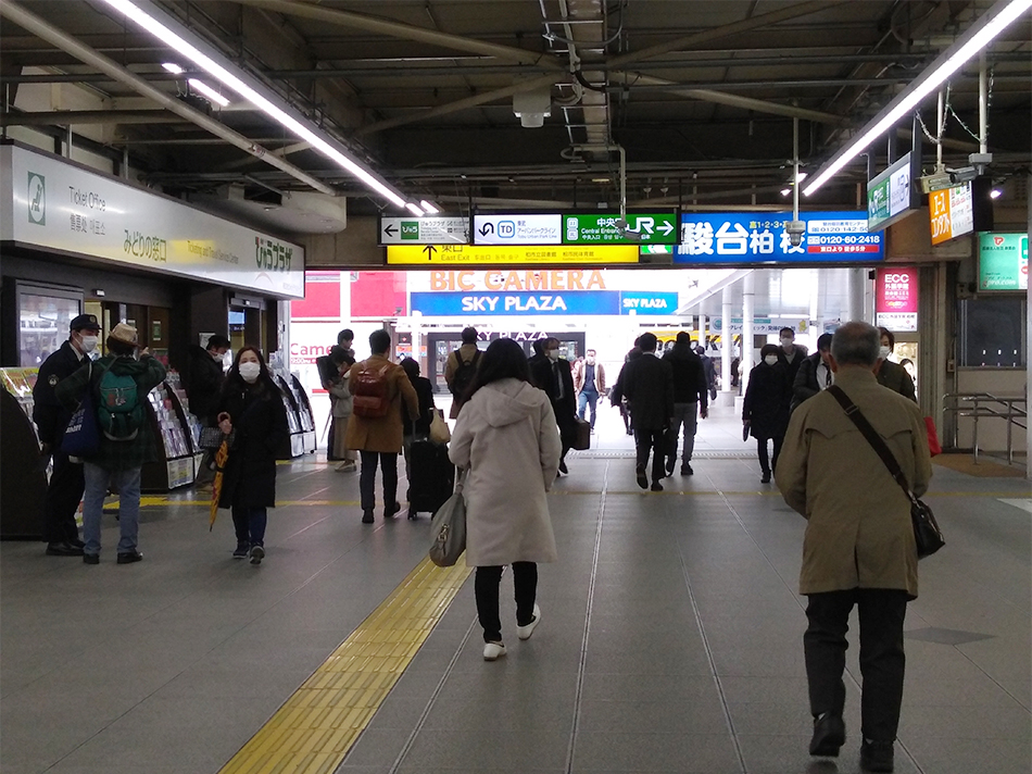 柏駅につきましたらまずは中央通路より東口へとお進みください。
