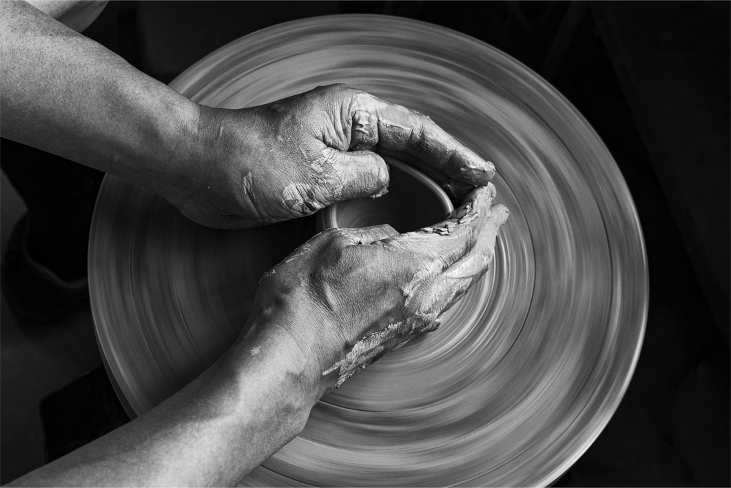 ろくろを使って陶芸をしている手を色を排除したモノクロで仕上げることで、手に付着した粘土、そして皮膚の皺や毛穴の質感など、その場の空気感がとても伝わってきます。