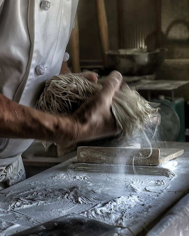 蕎麦や蕎麦粉がまるで生きているような動きで、手際良くはたらく手の表情がとても伝わる作品です。