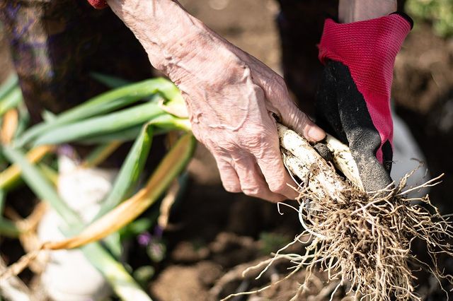 年齢を重ねた手とネギを対角線の構図で撮ることで、纏まりの良い画面構成になっています。