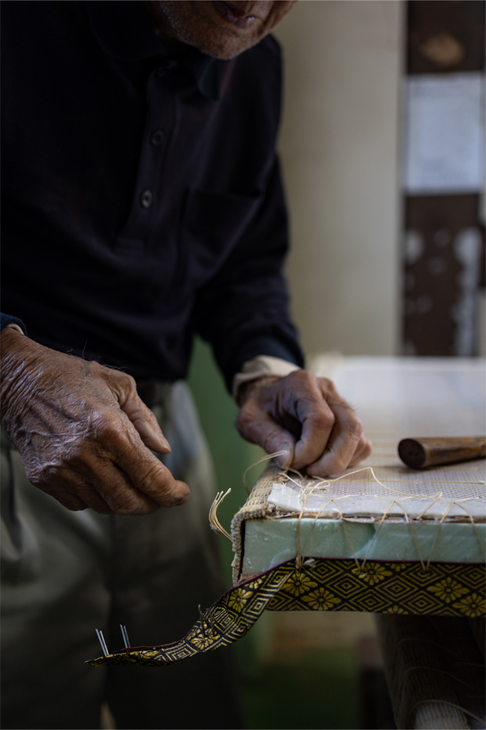 畳を作っているのか、修理をしているのか、昔ながらの熟練した畳職人のはたらく手が印象的な作品です。